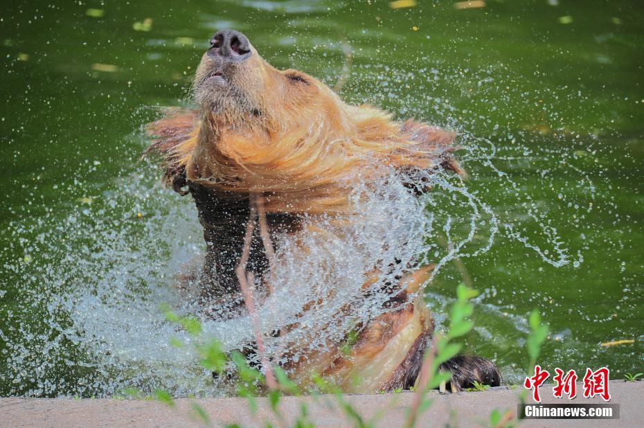 6月6日,天津动物园,一只熊在水中嬉戏。天津持续高温,动物园采取各种方式为动物防暑降温。 中新社记者 佟郁 摄