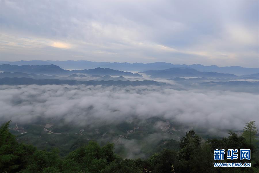 从蜀南竹海的观云亭北望,云海与连绵的峰丛、优美的田园民居相映成趣(6月6日摄)。 新华社记者江宏景摄
