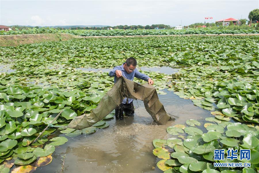 6月7日,工作人员在嵊州市崇仁镇钳口田园综合体的荷花田查看套养的鱼虾。 新华社记者 翁忻旸 摄