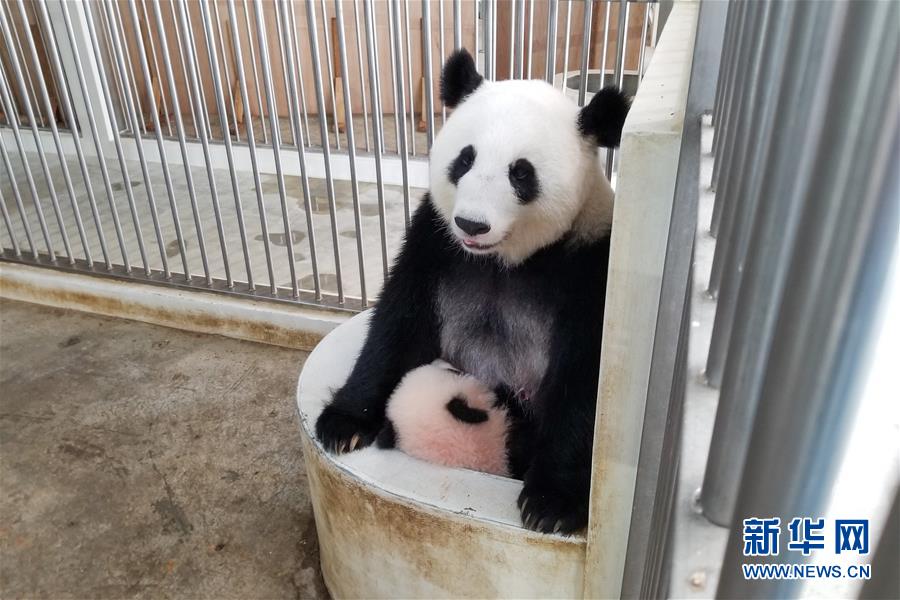 6月7日,在马来西亚吉隆坡附近的马来西亚国家动物园,旅马大熊猫“靓靓”在给大熊猫宝宝喂奶。新华社记者朱炜摄