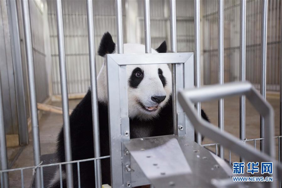 6月7日,在马来西亚吉隆坡附近的马来西亚国家动物园,大熊猫“靓靓”望着手里拿着食物的阿克迈勒(不在画面中)。新华社记者朱炜摄