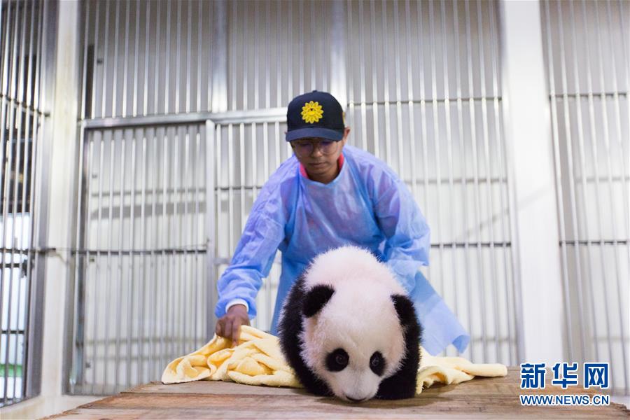 6月7日,在马来西亚吉隆坡附近的马来西亚国家动物园,阿克迈勒准备将大熊猫宝宝抱到“育儿房”。新华社记者朱炜摄
