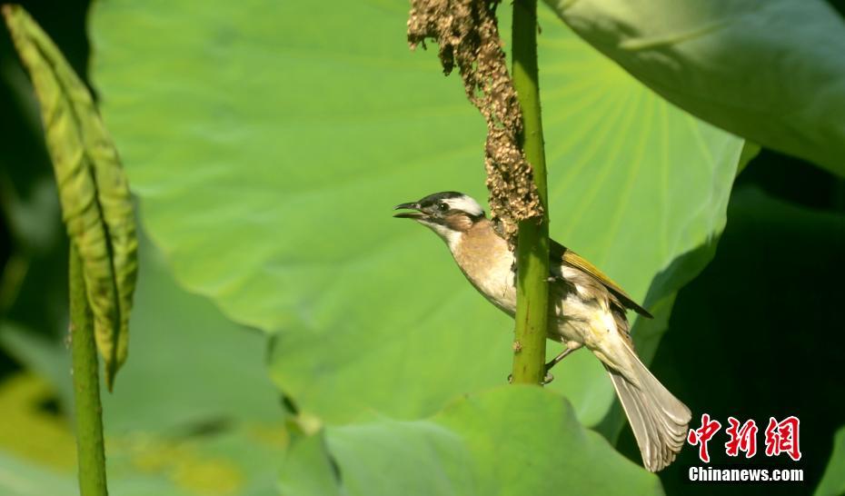 小鸟抓住莲蓬的枝杆嬉戏。孟德龙 摄
