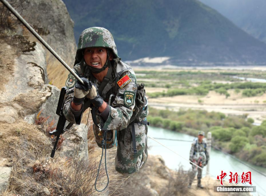 西藏军区某合成旅将在今年8月组织参赛队代表中国陆军赴俄罗斯参加厄尔布鲁士之环大赛。近日,西藏军区某合成旅官兵在雪域高原开展训练,备战这一国际赛事。图为该旅侦察兵做吊渡过河训练。中新社发 唐方明 摄