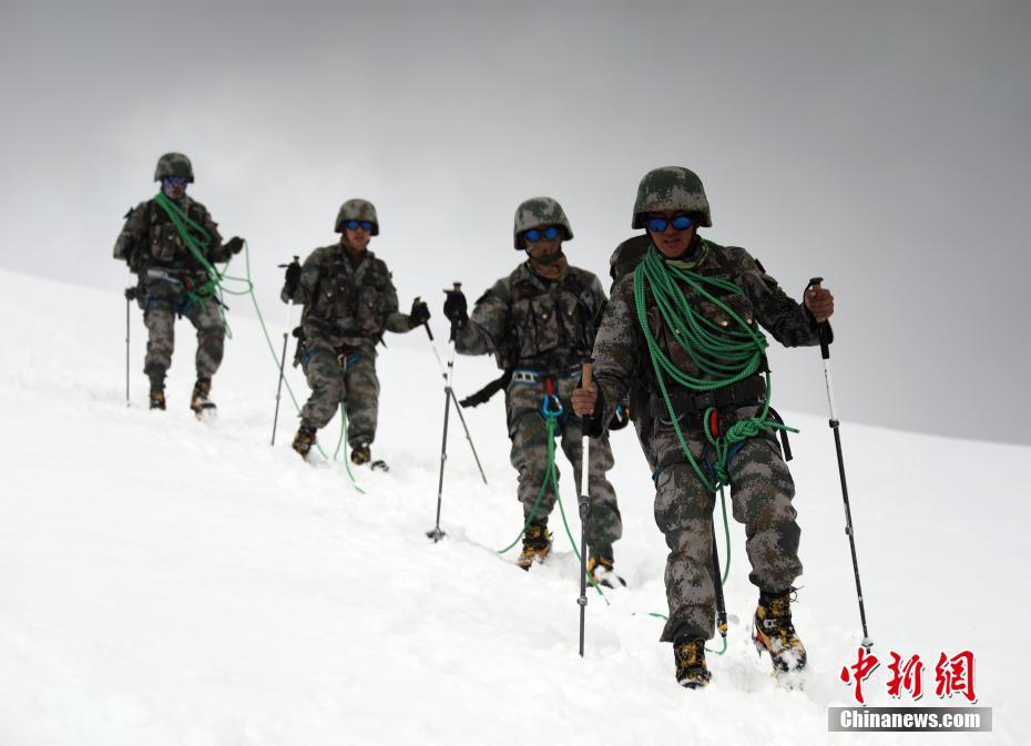 西藏军区某合成旅将在今年8月组织参赛队代表中国陆军赴俄罗斯参加厄尔布鲁士之环大赛。近日,西藏军区某合成旅官兵在雪域高原开展训练,备战这一国际赛事。图为该旅侦察兵们做雪山攀登训练。中新社发 仵朝阳 摄