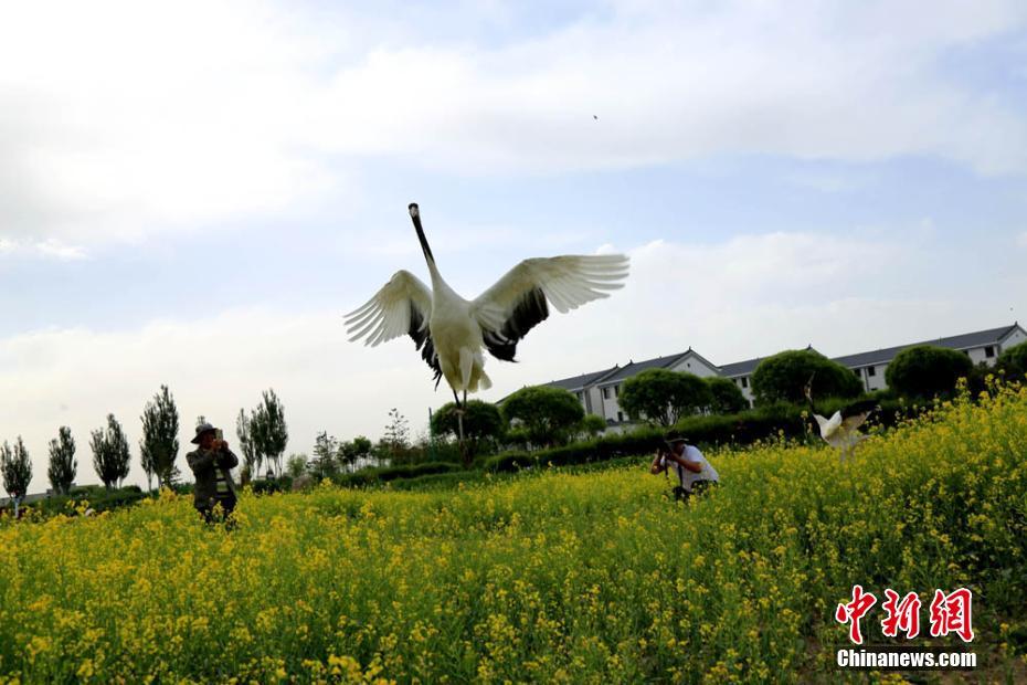 振翅而飞的丹顶鹤吸引游人纷纷拍照。陈礼 摄