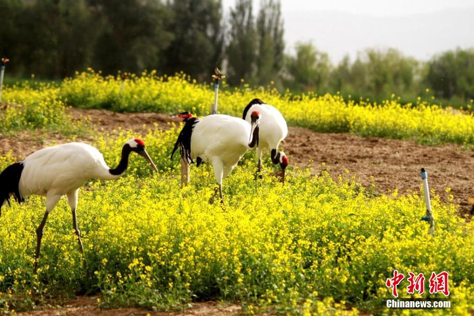 丹顶鹤结伴在油菜花田中漫步。陈礼 摄