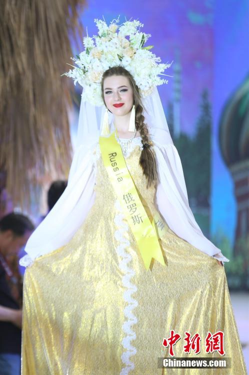 6月20日,首届丝路天使总决赛在甘肃嘉峪关举行。各国佳丽通过民族服饰秀、晚礼服秀、泳装秀以及才艺比拼四个环节进行冠亚季军的角逐。图为俄罗斯佳丽在比赛中展示民族服饰。中新社记者 熊然 摄