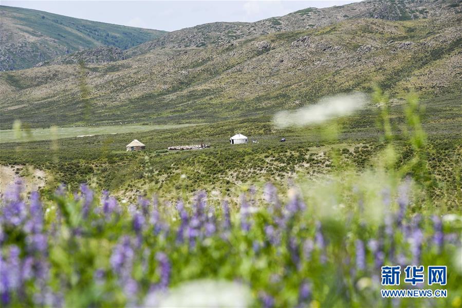 这是在新疆塔城地区额敏县喀拉也木勒镇拍摄的一处夏季牧场。入住新村后,克什克尼托别村的村民逐渐改变了以往的放牧方式,大多选择将牲畜托管给专人代牧(6月20日摄)。