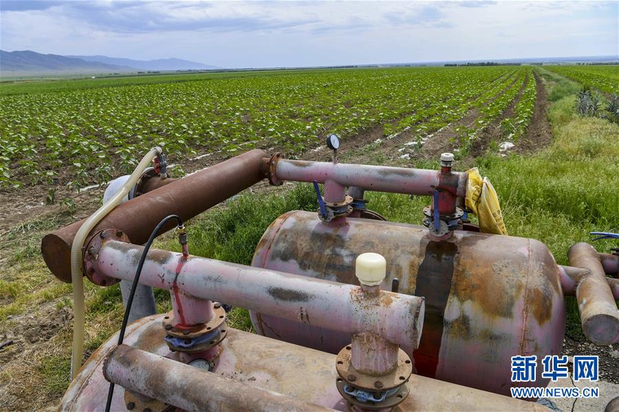 这是在新疆塔城地区额敏县喀拉也木勒镇克什克尼托别村农田拍摄的一处滴灌设施。近年来,当地通过改良土地和加强农田基础设施建设,提高了土地承包费用,为村民增加了收入(6月20日摄)。新华社记者 胡虎虎 摄