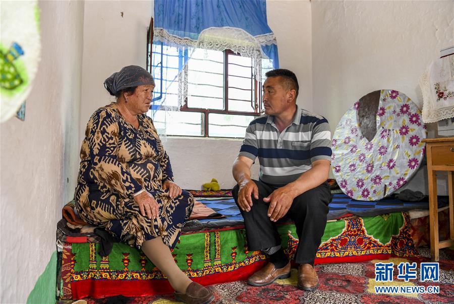 在新疆塔城地区额敏县喀拉也木勒镇克什克尼托别村,村民委员会主任阿依很·别克扎提汗(右)在55岁的沙吾列提·哈布德阿力家中走访。沙吾列提家因病致贫,已于2017年脱贫摘帽,为了防止返贫,村里计划通过“一对一帮扶”替她解决困难(6月20日摄)。新华社记者 胡虎虎 摄