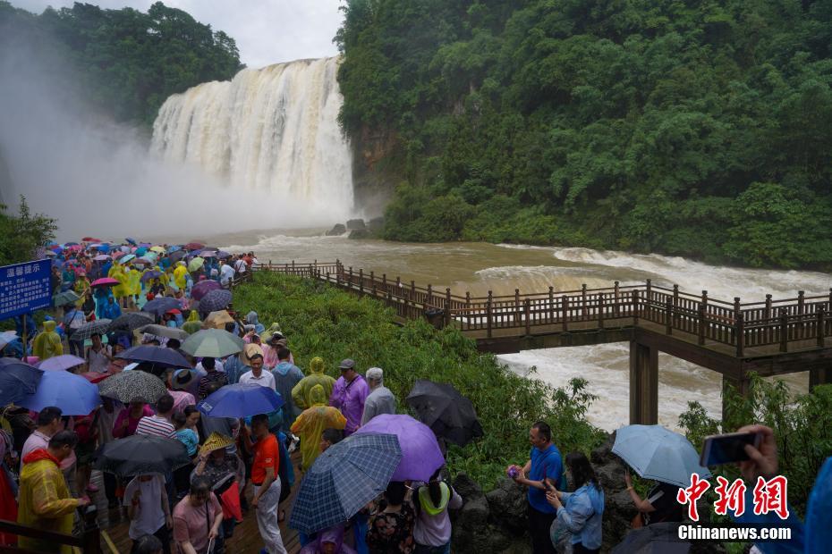 6月23日,贵州黄果树瀑布壮观景象吸引大批游客观赏。受近日持续降雨影响,位于贵州省安顺市的黄果树瀑布进入丰水期。 中新社记者 贺俊怡 摄