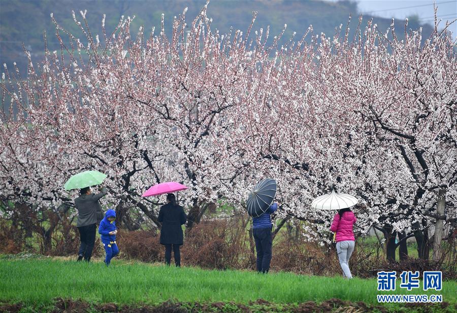 游人在长安区引镇街道胡刘村的杏花林前游览(3月17日摄)。