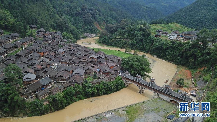烟雨中的贵州省榕江县乌公侗寨风光(6月24日无人机拍摄)。 6月24日,贵州榕江县的侗族村寨笼罩在烟雨之中,仿佛披上了一层轻纱霓裳,构成了一幅幅秀美的山水画卷。 新华社记者 欧东衢 摄