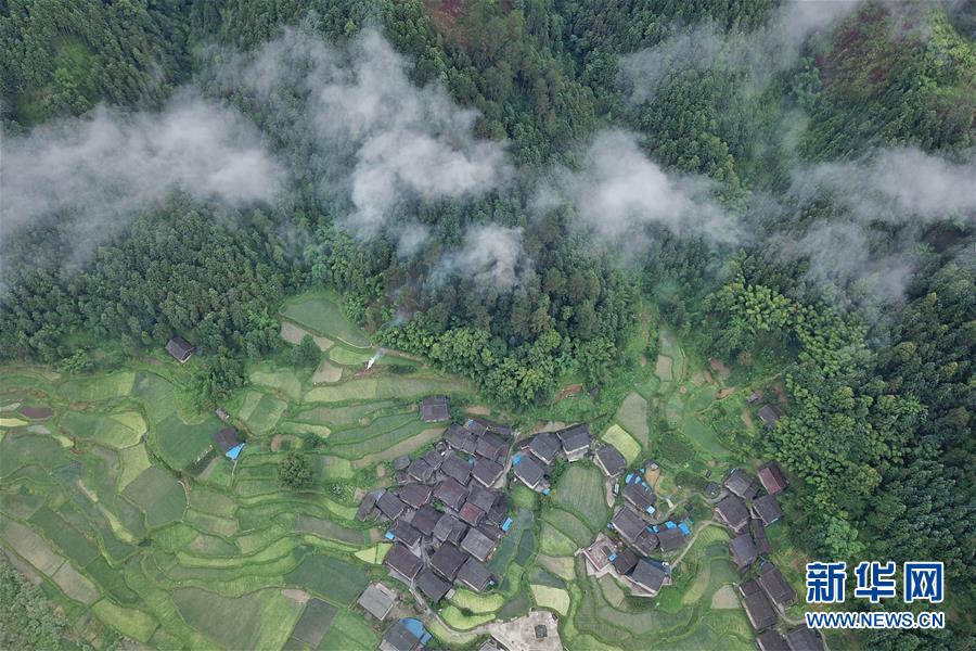 烟雨中的贵州省榕江县寨蒿镇三洲村风光(6月24日无人机拍摄)。 6月24日,贵州榕江县的侗族村寨笼罩在烟雨之中,仿佛披上了一层轻纱霓裳,构成了一幅幅秀美的山水画卷。 新华社记者 欧东衢 摄