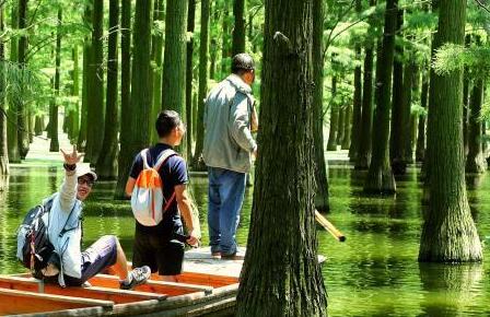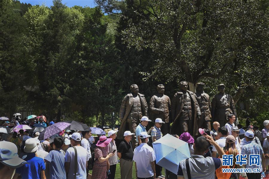 6月28日,游人在延安革命旧址枣园《走向胜利》塑像前参观。