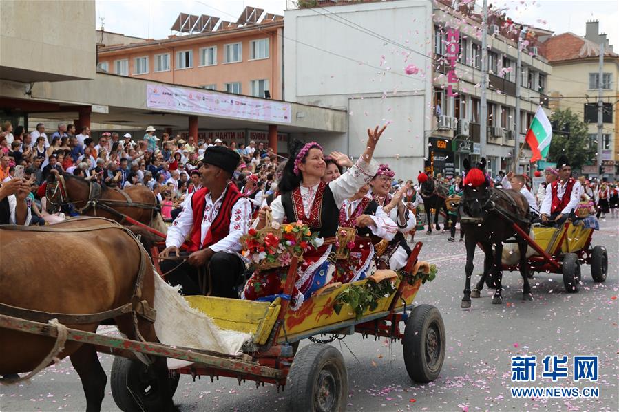 保加利亚自然环境得天独厚,人文历史遗产丰富,传统文化独具特色,每年吸引大量游客到此旅游。保加利亚是著名的玫瑰花种植和玫瑰产品生产国。每年6月,位于保境内巴尔干山脉中部南麓的“玫瑰谷”都要举行各种庆祝活动,其中以卡赞勒克市的“玫瑰皇后”评选和花车游行最为著名。这是2018年6月3日拍摄的花农在保加利亚卡赞勒克“玫瑰节”花车游行中向游人抛洒玫瑰花瓣。新华社记者战小漪摄