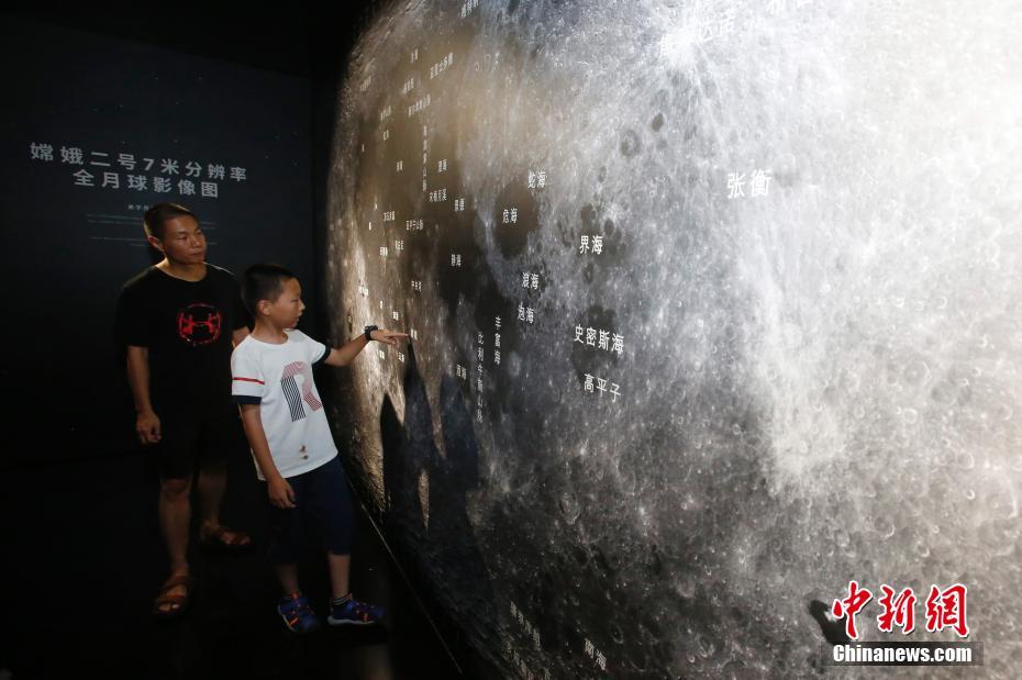 7月8日,市民参观“嫦娥二号7米分辨率全月球影像图”。当日,北京水立方举行“月光如水”中国探月科技与卢克·杰拉姆“月球博物馆”特展。据介绍展览通过在水立方比赛大厅空间内悬挂的10米直径“月亮”,与其在泳池中的倒影,呈现水立方独有的“月色如水”。中新社记者 韩海丹 摄