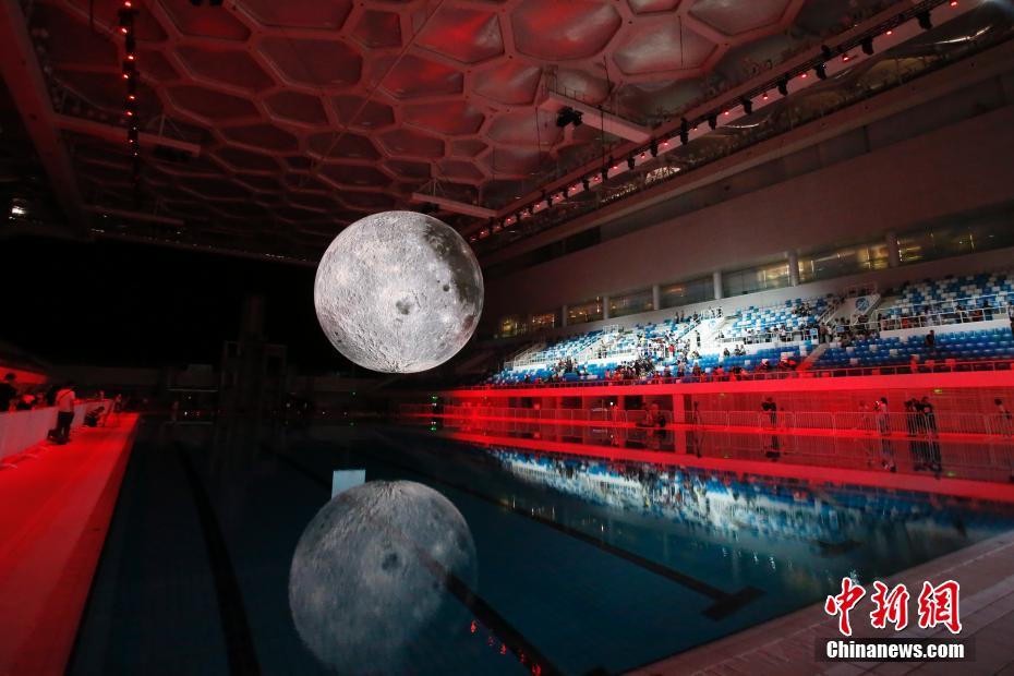 7月8日,北京水立方举行“月光如水”中国探月科技与卢克·杰拉姆“月球博物馆”特展。据介绍展览通过在水立方比赛大厅空间内悬挂的10米直径“月亮”,与其在泳池中的倒影,呈现水立方独有的“月色如水”。中新社记者 韩海丹 摄