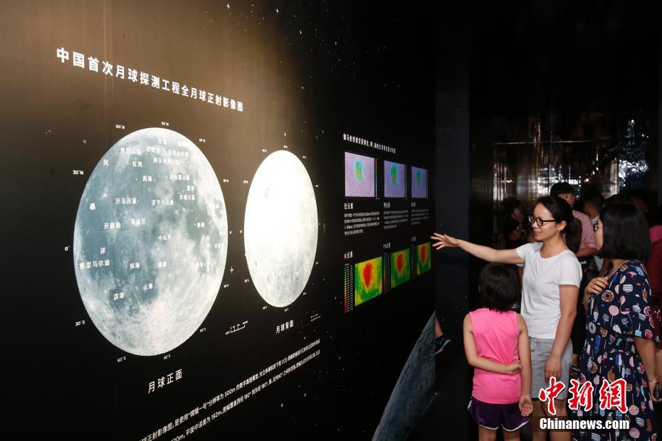 7月8日,市民参观展览。当日,北京水立方举行“月光如水”中国探月科技与卢克·杰拉姆“月球博物馆”特展。据介绍展览通过在水立方比赛大厅空间内悬挂的10米直径“月亮”,与其在泳池中的倒影,呈现水立方独有的“月色如水”。中新社记者 韩海丹 摄