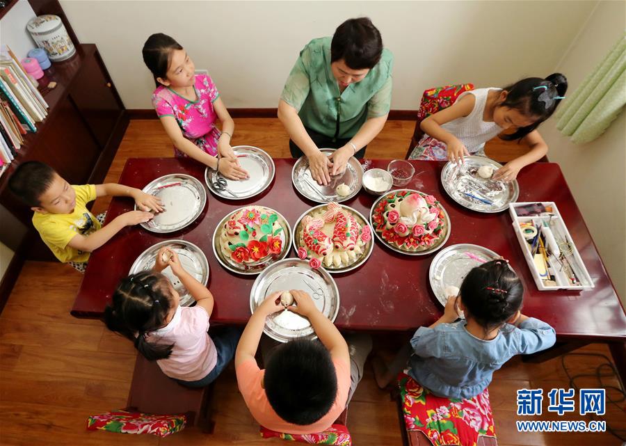 7月8日,山东省枣庄市非物质文化遗产“鲁南花馍”传承人王欣(上中)在家中向孩子们传授“鲁南花馍”制作技艺。