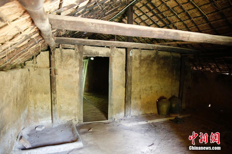 近日,记者在海南省东方市白查村探访了黎族传统民居船型屋。据悉,船型屋因其低矮的外形酷似一艘倒扣的船而得名。图为船型屋内光线幽暗。屋中间立三根叫“戈额”的木柱象征男人;两边立6根较矮的柱子,黎语叫“戈定”,象征女人。 中新社记者 王晓斌 摄