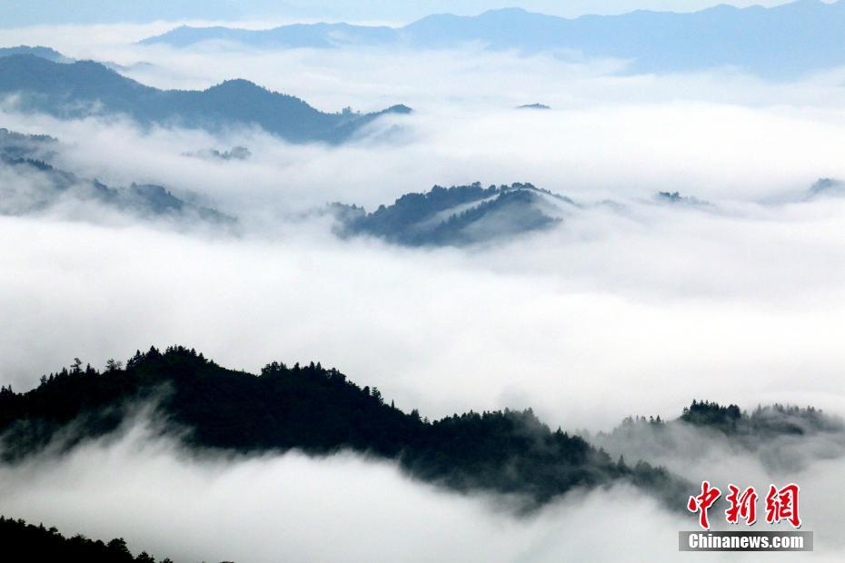 7月9日,在江西省遂川县大坑乡佛祖仙,缭绕的云雾在山谷之间不断涌动,美不胜收。山峰在云雾中若隐若现,犹如人间仙境。那些缠绕在半山的云雾,像系在山腰间的一条条玉带,在山间游动,绘就了一幅幅水墨丹青画。李建平 摄
