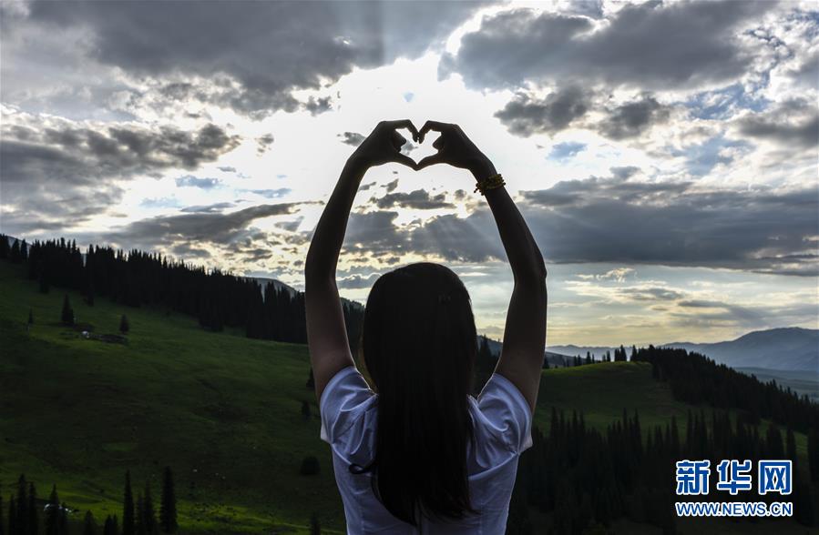 在那拉提景区天成台,一位游客迎着夕阳做出了“心”的动作(7月8日摄)。
