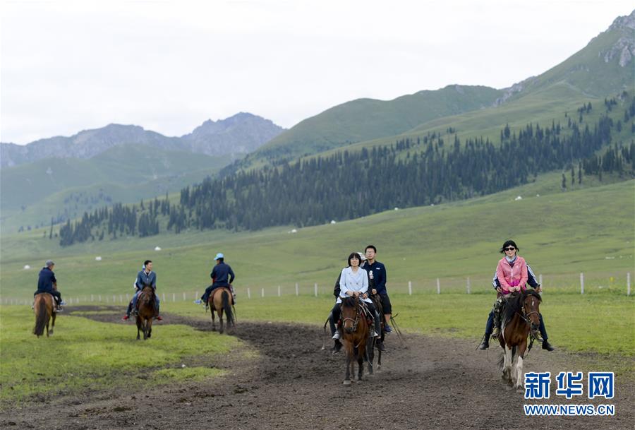 游客在那拉提“空中草原”骑马游玩(7月8日摄)。
