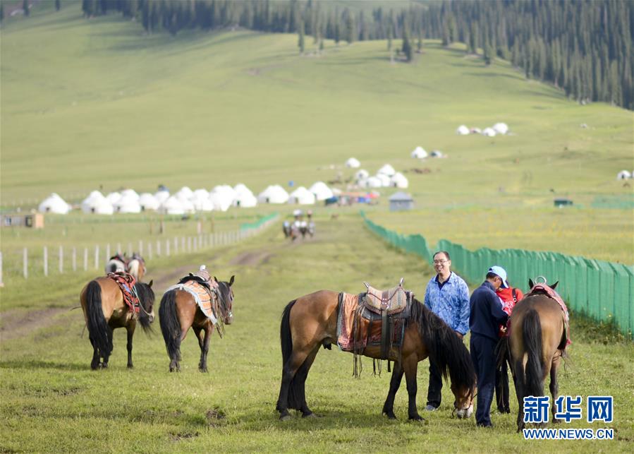 眼下正值新疆那拉提景区旅游旺季,当地景区活跃着由牧民组成的马队。牧民带着自己的马匹参加旅游合作社,参与当地旅游业的发展,走上了“生态致富路”。新华社记者 赵戈 摄