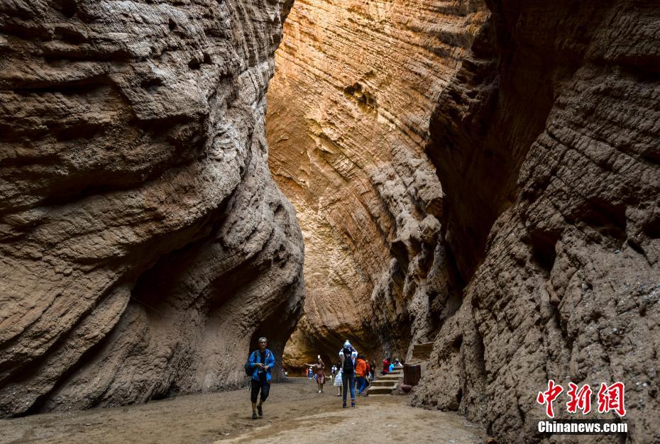 7月10日,游客在新疆库车的天山大峡谷中游览,领略大自然的鬼斧神工。天山库车大峡谷,又称克孜利亚大峡谷,位于阿克苏地区库车县北部,呈东向西纵深长约5.5公里。山体为红褐色岩石经风雕雨刻而成,峡谷曲径通幽,别有洞天。中新社记者 刘新 摄