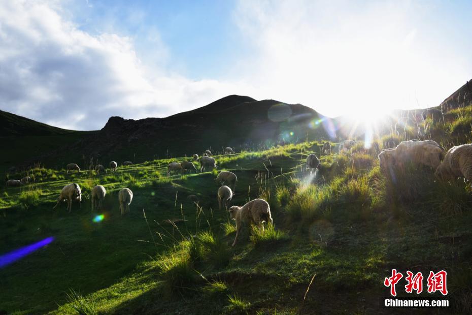 7月12日,祁连山下雨过天晴。甘肃张掖市肃南裕固族自治县皇城镇境内的夏日塔拉草原轻风吹拂,绿色草原随风荡漾,牛羊成群在草地上觅食奔跑。武雪峰 摄