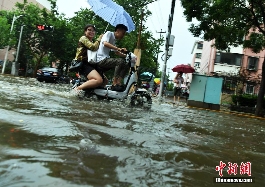 7月16日下午,河北石家庄一条马路积水严重,民众涉水骑行。当日,该省气象台发布暴雨蓝色预警,承德、雄安新区、廊坊北部、石家庄中西部、邢台西部等多地遭受暴雨袭击。中新社记者 翟羽佳 摄