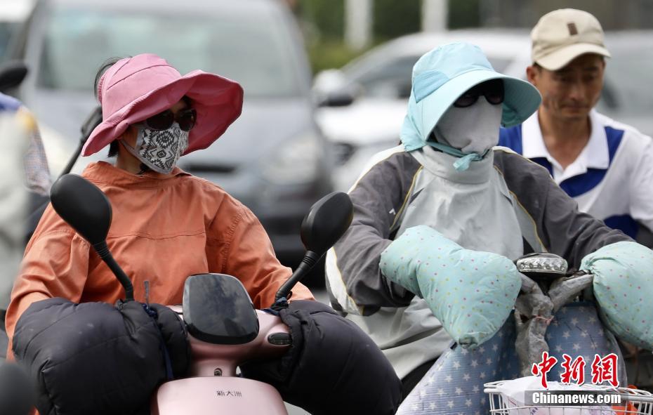 7月16日,南京街头两名市民“全副武装”骑车出行。当日,南京继续高温晴热天气。中新社记者 泱波 摄