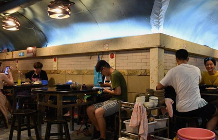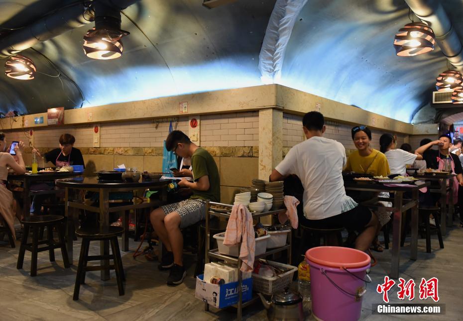 7月17日,是今年入伏的第一天,重庆高温天气持续,当日最高气温达37℃以上,民众防空洞内吃火锅消暑。因“山城”重庆是“火炉”,更因地理位置的特殊,不少防空洞被合理开发利用起来,吸引民众前往避暑纳凉。据悉,众多防空洞不仅被开发利用成了市民的避暑纳凉点,也有的防空洞被改造成为了酒窖、火锅店、加油站等商业用途。周毅 摄