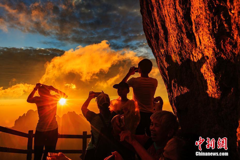 7月16日,安徽黄山风景区现云海佛光和晚霞景观。当天下午,“白如银、软如棉、飘如纱、动如烟”的黄山云海,时而狂放汹涌,时而清纱漫舞,漂浮在青松黛石之间。佛光在朦胧的山体中闪现,愈显黄山奇峻和瑰丽。霞光映照,群峰熠熠生辉,云天流光溢彩,如同一幅幅色彩丰富的画卷铺展开来,现场的游客和摄影爱好者纷纷用相机或手机记录一幕幕精美的画面。叶永清 摄