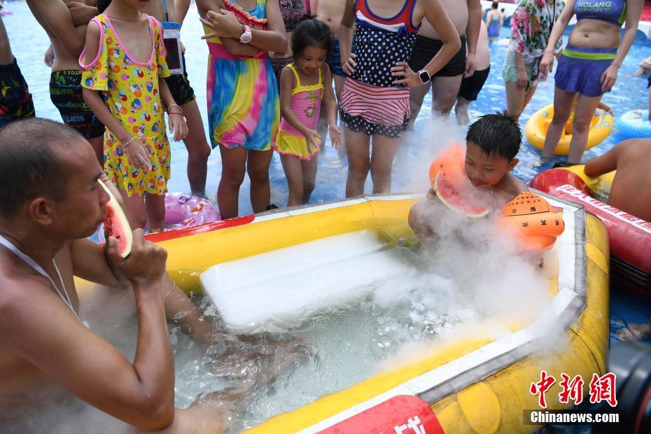 7月17日,重庆洋人街水上乐园举行挑战躺冰船活动迎“入伏”,游客们纷纷躺在放有冰块和干冰的水船内吃着西瓜享受清凉。当日,重庆市气象局发布了“高温橙色预警”信号。陈超 摄