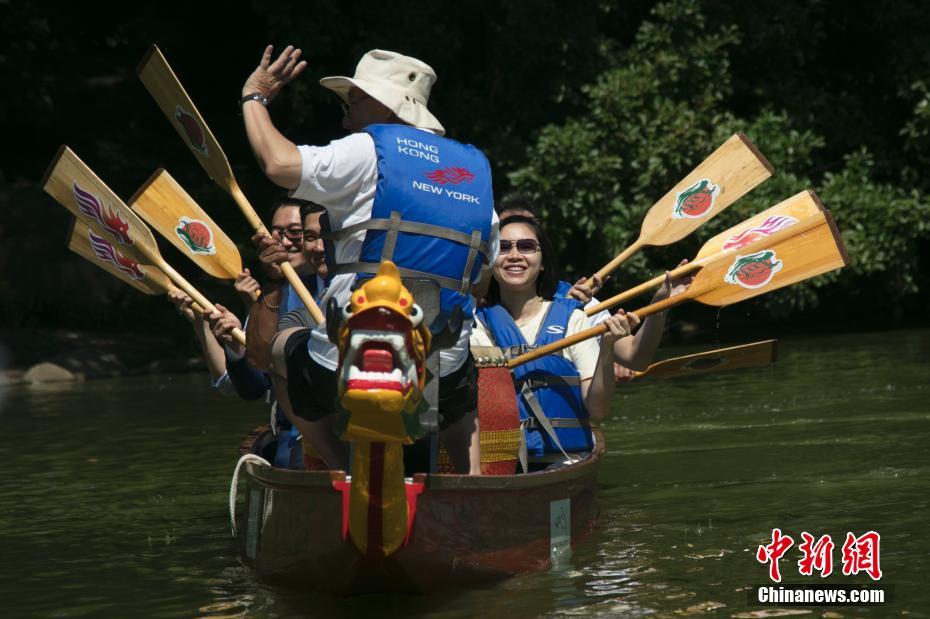 当地时间7月18日,2018年纽约香港龙舟节点睛仪式在中央公园举行。2018年纽约香港龙舟节将于8月11日及12日在皇后区法拉盛草原可乐娜公园湖举行,将有逾200支龙舟队参赛。图为在仪式前纽约香港龙舟节主席万三权(前)邀请嘉宾划龙舟。 中新社记者 彭伟祥 摄