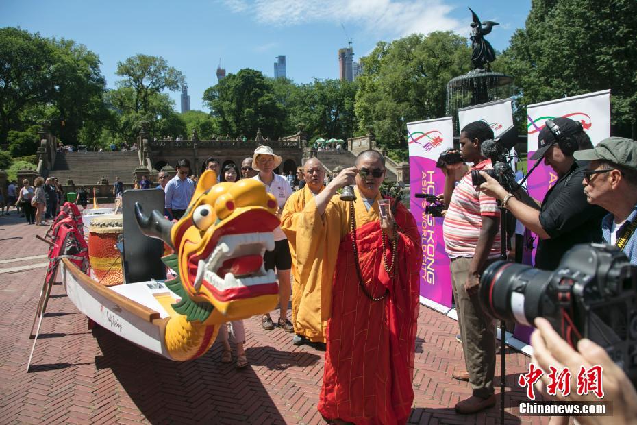 当地时间7月18日,2018年纽约香港龙舟节点睛仪式在中央公园举行。2018年纽约香港龙舟节将于8月11日及12日在皇后区法拉盛草原可乐娜公园湖举行,将有逾200支龙舟队参赛。 中新社记者 彭伟祥 摄