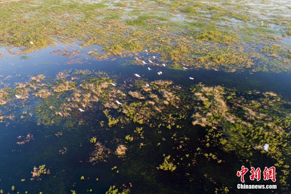 7月19日在江西九江市永修县吴城镇拍摄的鄱阳湖湿地风光。盛夏的鄱阳湖湿地水草碧绿,河道蜿蜒,在夕阳的映衬下,呈现出“落霞与孤鹜齐飞,湖水共长天一色”的美丽景观。中国第一大淡水湖鄱阳湖湿地是最早七个列入国际重要湿地名录的湿地之一,蕴藏着丰富的动植物资源和独特的自然景观。 傅建斌 摄