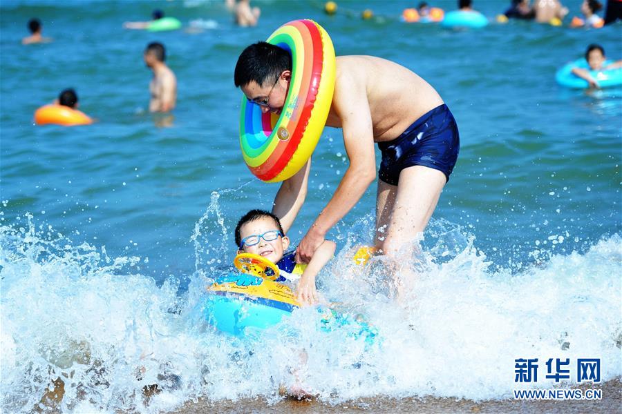 7月21日,一对父子在山东省日照市万平口滨海景区戏水游玩。 新华社发(俞方平 摄)