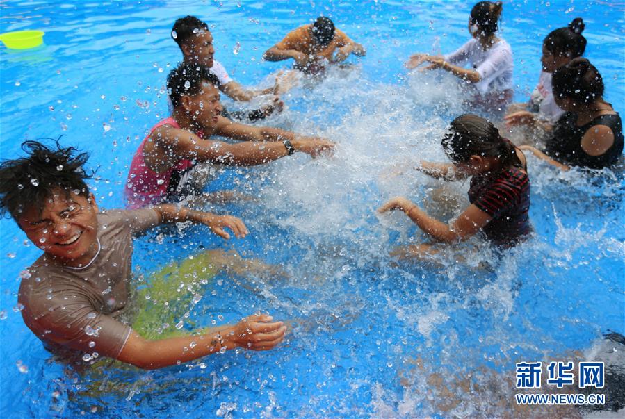 7月21日,游客在山东省临沂市沂南县竹泉村一游泳池戏水。 新华社发(王彦冰 摄)