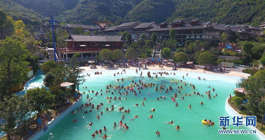 7月20日,游客在贵州省剑河县一处水上乐园戏水避暑(无人机拍摄)。 新华社发(方鹏 摄)