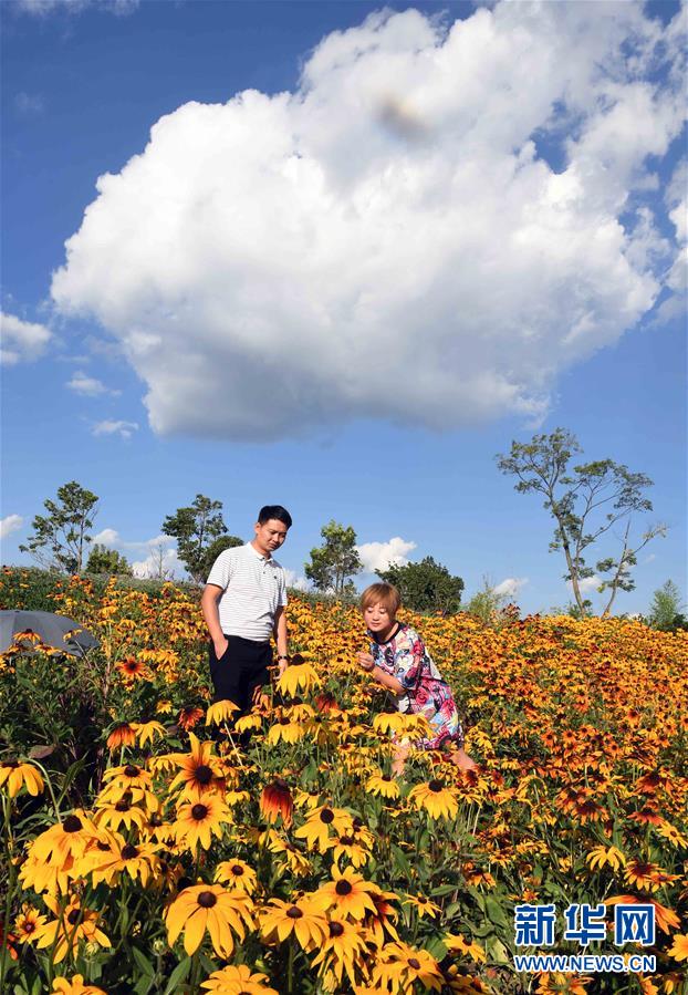 7月21日,两名游客在曲靖市金麟湾爱情小镇花海中赏花。