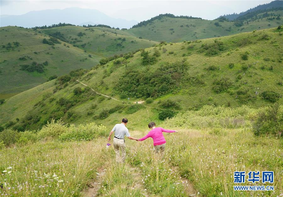 7月21日,游客在神田草原一处小路上行进。 在陕西岚皋县与重庆城口县交界处的大巴山主脊上,坐落着一片高山草甸——神田草原。入夏,这里碧草千顷,野花漫山,气温凉爽,云雾变幻,成为游客休闲避暑的好去处。 新华社记者邵瑞摄