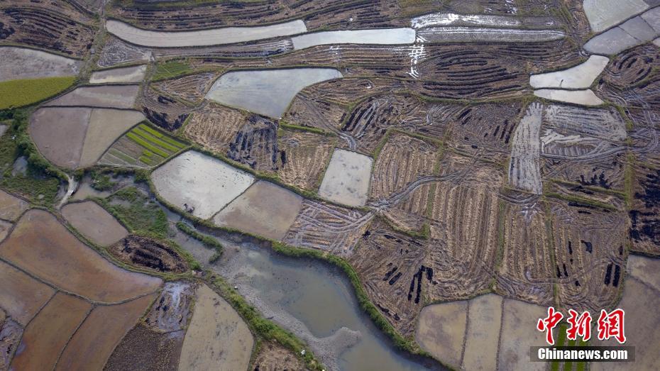 7月22日,记者航拍广西壮族自治区来宾市兴宾区三五镇壮族小山村——古炼村,该村三百多亩水田全为梯田。农民们抢收春季稻谷后,正在耙田抢种秋季稻谷。从天空俯瞰,壮族山村的稻田美如画。 蒋雪林 摄