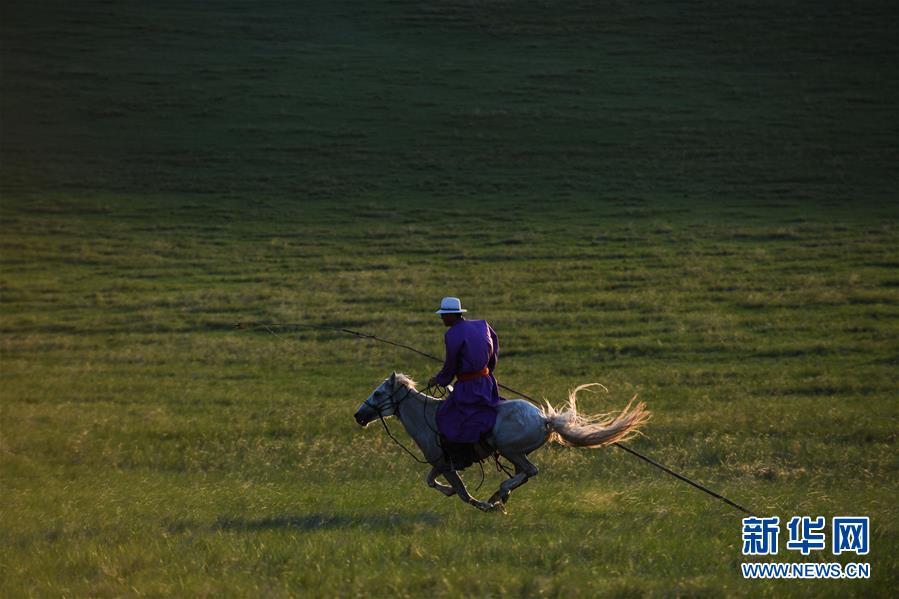 内蒙古自治区西乌珠穆沁旗地处锡林郭勒大草原,当地繁育养殖白马的历史悠久。正值旅游旺季,西乌珠穆沁旗的牧民们在草原上驯马,为游客展现了精彩壮观的蒙古族草原民俗文化。 新华社记者 刘磊摄