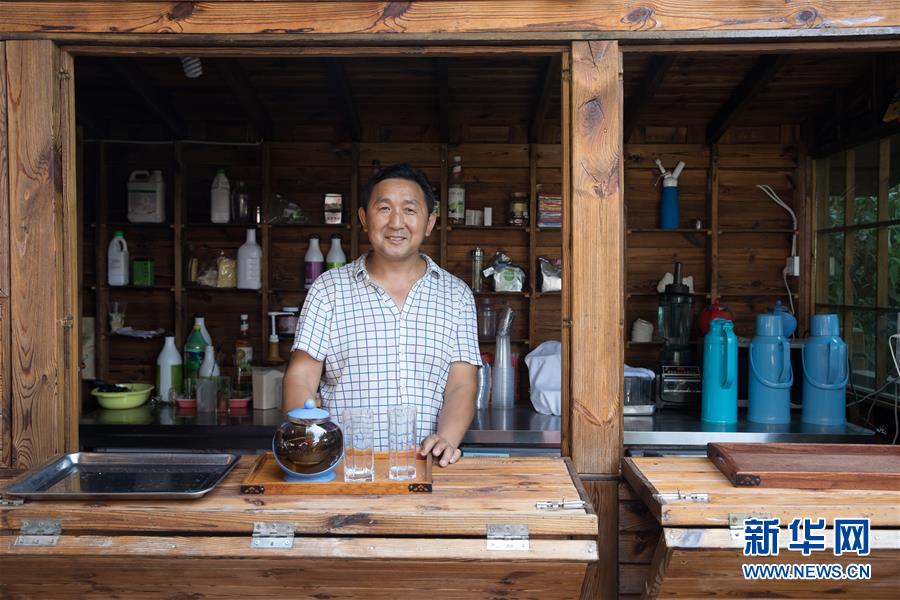 52岁的徐学书在自家开的奶茶吧台前。他说,家里有9亩茶园,不过他家只卖茶青,这一块每年有4万元左右的收入(7月22日摄)。 新华社记者 金立旺摄