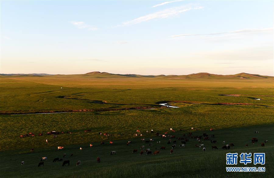 盛夏时节,内蒙古东乌珠穆沁旗草原成为碧绿的海洋,弯弯曲曲的乃林河流淌其间,牛羊星星点点散落在河边,美如画卷。