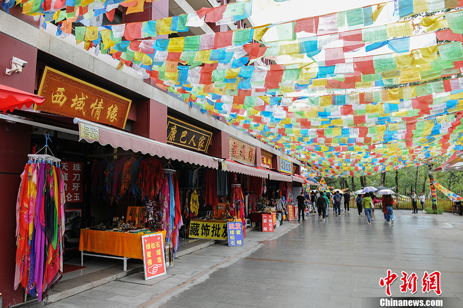 7月23日上午,淅淅沥沥的小雨浸润了这座高原风情商街,古朴典雅的巷道里,店铺鳞次栉比。“大美青海·梦幻察尔汗2018全国重点网络媒体看青海”采访团的40余名编辑记者相聚于此,探访“香巴林卡·宗喀驿”文化旅游智慧模式。图为宗喀驿一角。 中新网记者 富宇 摄